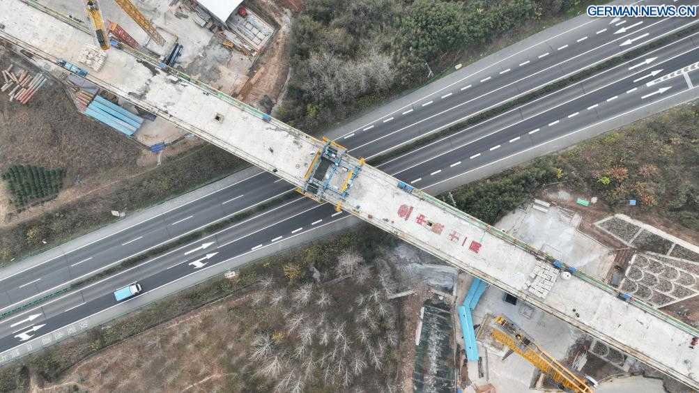 Die Luftaufnahme einer Drohne vom 2. Dezember 2025 zeigt die Baustelle einer Brücke der Hochgeschwindigkeitsbahnstrecke Hefei-Wuhan über die Schnellstraße Shanghai-Chengdu im Kreis Jinzhai der Stadt Lu'an in der ostchinesischen Provinz Anhui. Die 1.940,57 Meter lange Brücke wurde am Dienstag fertiggestellt.